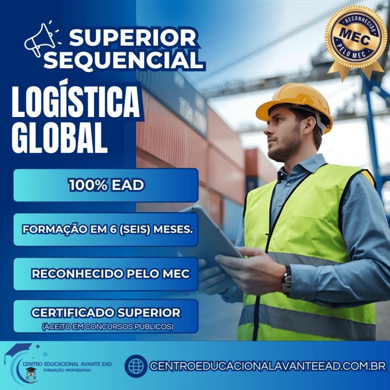 Superior Sequencial em Gestão de Logística Global prepara os alunos para atuar em operações logísticas internacionais, otimizando transporte, armazenagem e distribuição. Os profissionais formados são capacitados a planejar, organizar e gerenciar cadeias globais, com foco na integração de cadeias, inovação e sustentabilidade. Metodologia: O curso é ministrado 100% na modalidade EAD, ou seja, totalmente à Distância, através de um Ambiente Virtual de Aprendizagem (AVA), dinâmico e facilitador. O Trabalho de Conclusão de Curso (TCC) é opcional. O aluno contará com vídeos, materiais didáticos e acompanhamento pedagógico durante todo curso.